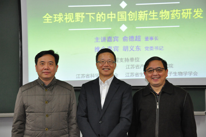 3月20日下午,由常州南京大学高新技术研究院/江苏省产业技术研究院(简称省产研院)医药生物技术研究所(简称医药所)等单位发起的“健创汇”生物医药创新创业系列讲座第二讲在南京大学仙林校区开讲。本期的授课嘉宾是信达生物制药董事长兼总裁、“千人计划” 特聘专家俞德超先生,省产研院党委书记胡义东是本期课程的推介嘉宾,医药所所长华子春教授主持讲座。